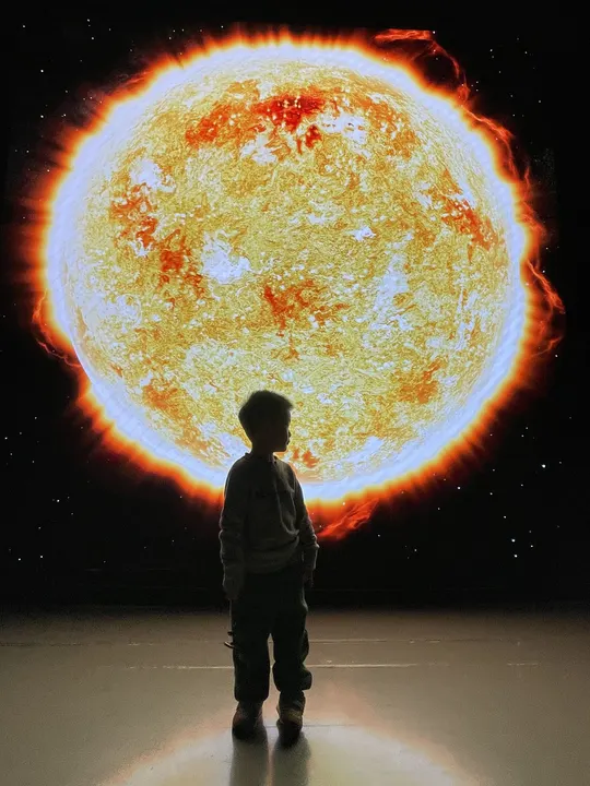 在苍茫的宇宙中,一个年幼的孩子静静地站在巨大的太阳前,被它那耀眼的光芒所吸引。孩子在太阳面前,感受到了宇宙的浩渺与神奇,同时也体验到了自身的微不足道。 这个场景让人不禁想起了人类探索宇宙的历程。从古代的观星者到现代的宇航员,我们一直在追寻着宇宙的奥秘。而在这个孩子身上,我们也看到了未来的希望和无限的可能性。 在这个瞬间,孩子与太阳之间形成了一种微妙的联系,这种联系既神秘又美好。它让我们重新审视自己在宇宙中的位置,也激发了我们对于未知的好奇心和探索欲望。