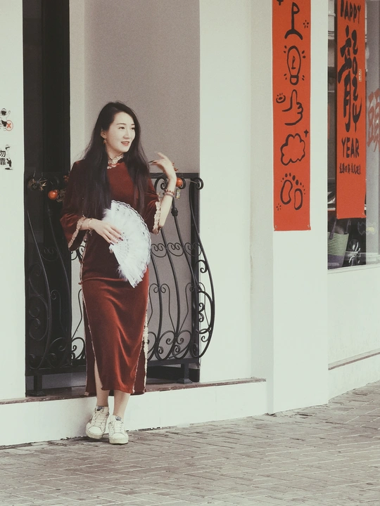 在小公园老街转角处,有一位身着旗袍、手执扇子的女人倚着铁通花栏杆,韵味十足。