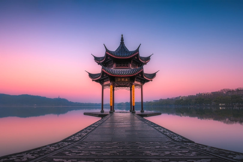 清晨维纳斯带环绕下的集贤亭安静的浮于水面,温柔如画,这大概就是古人诗中“欲把西湖比西子,淡妆浓抹总相宜”的绝美场景吧