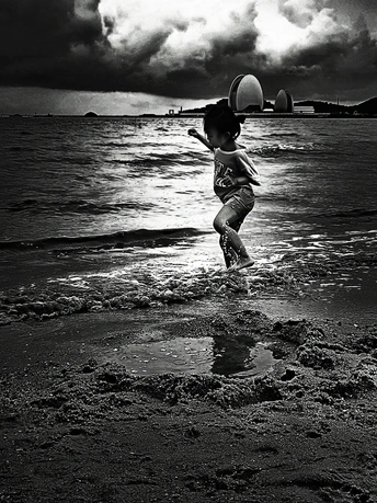 低压槽之下 阴翳的天空 海浪浅泛花 这样的一个下午 来到海边并不能 让本已经压抑的 情绪 得到舒展 她来了 一个纯真的小女孩 她是海的女儿吗 踏着浪花起舞 是多么欢快 这时候 周围一切都成了 她舞台布景 是氛围与道具 她是心无旁骛的 感染了大家 大家为她 在自己内心里 鼓掌和欢呼