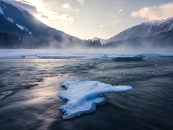 中国新疆的喀纳斯神仙湾,2月初的深冬时节,上午11点太阳才刚刚爬过山脊,阳光的色彩依旧十分温暖。河道中也正好起了晨雾,河面反射着光线,大块的浮冰在流水中归然不动。