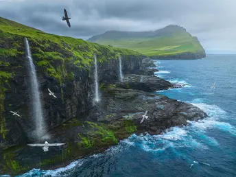 三条瀑布坠海而入,眼前是一望无际湛蓝的北大西洋和肆意翱翔的海鸟。这是个偶然间发现的地方,空旷无人,只有宁静。