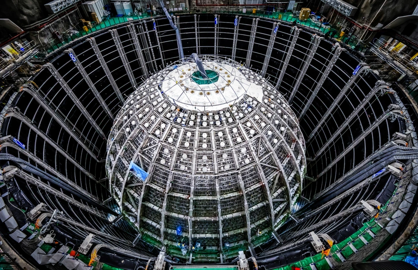 2023年9月24日,广东省开平市金鸡镇,处于世界领先水平的江门中微子实验中心探测器正在安装测试中。据了解,处于地下700米的巨型实验室2024年建成运行后,将肩负探索宇宙起源奥秘的重任,捕捉来自宇宙的“幽灵粒子”。