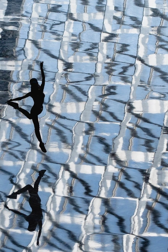 在北京国家大剧院,一名年轻女子在大理石地板上高高跃起,在空中跳舞,庆祝她的第一场正式演出圆满结束。地面反射出剧院独特的穹顶,就像一首音乐的音符。展现青春的律动。