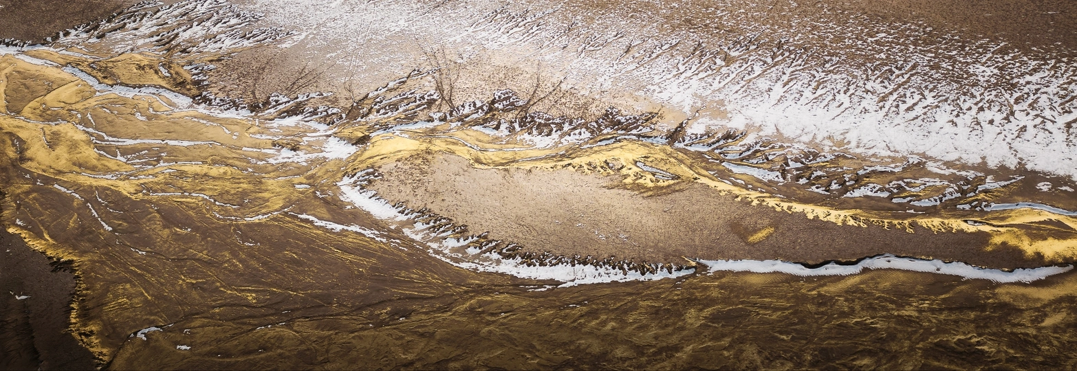 黄河是中华文明的主要发祥地,中国人称之为“母亲河”。黄河以其独特的颜色而闻名,因为它每年都会向下游地区输入大量肥沃的沉积物,并形成冲积平原。在冬季旱季,流量减少的黄河会有大量河床裸露,其携带的泥沙会留下清晰的轨迹。低温还导致一些河水结冰,形成了一幅融合了白色和金色的独特的大地画。