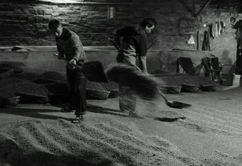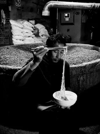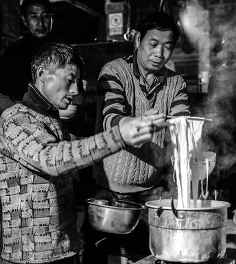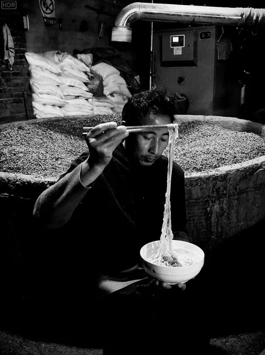 “共饮长江水”摄影工作坊系列作品,在以酒而闻名的宜宾,现代化的大酒厂其先进的生产设备要有尽有,而纯人工的老酒厂却有着旺盛的生命力。接下来,跟着照片我们一起走进老酒厂,近距离观看在青瓦房下,工人们的制酒工艺。拍摄于2023年3月15日—21日。 图1 搅拌产酒原料 高粱 摄影 彭永平 图2 工人的早餐 摄影 崔连忠 图3 工间休息 摄影 彭永平 图4 工人的早餐 摄影 张嘉禾 图5 备料 添加酵母粉 摄影 张嘉禾