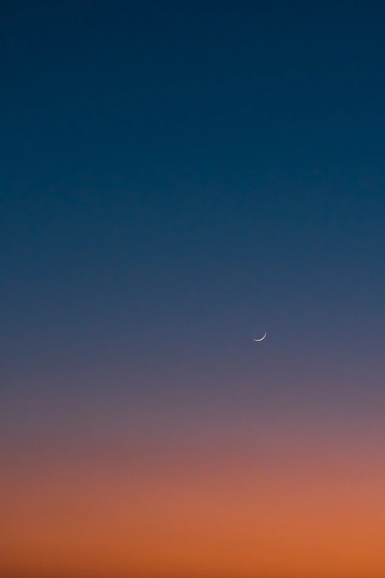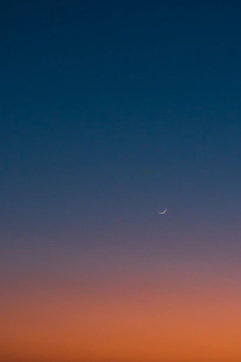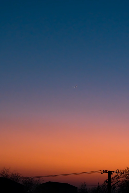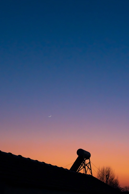 过年回老家,吃过晚饭爬上屋顶,一弯月亮悬挂天空。