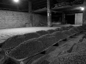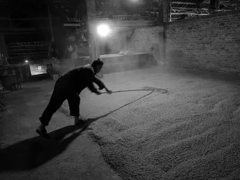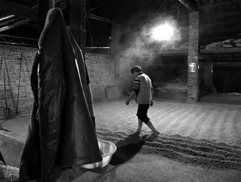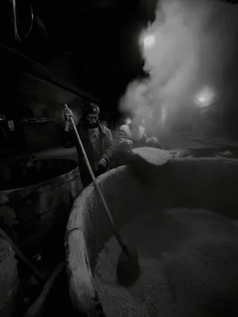 “共饮长江水”摄影工作坊系列作品,在以酒而闻名的宜宾,现代化的大酒厂其先进的生产设备要有尽有,而纯人工的老酒厂却有着旺盛的生命力。接下来,跟着照片我们一起走进老酒厂,近距离观看在青瓦房下,工人们的制酒工艺。拍摄于2023年3月15日—21日。 图1 备料 摄影 张嘉禾 图2 工间 摄影 梁少军 图3 拌料 摄影 梁少军 图4 搅拌高粱 摄影 孙宴生 图5 做酒的原料 高粱 摄影 孙宴生