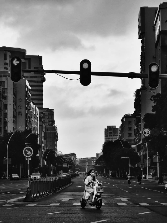 早晨,我经过十字路口等待过马路,发现西边的天空一片亮光,而地物还是比较昏暗,光比不错。于是,先构好图伺机抓拍路口动态,后期调整光影效果等。