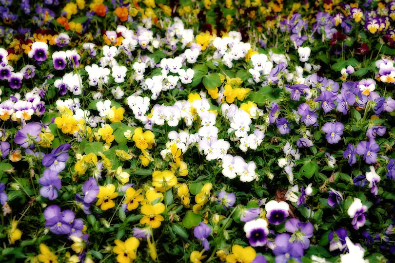 这张图片展示了一个美丽的花海。花海中盛开着各种颜色的花朵,包括紫色、白色、黄色等。这些花朵可能是三色堇,它们的花瓣上有深色的条纹或斑点。花海非常茂密,花朵们紧密地簇拥在一起,形成一片色彩斑斓的海洋。这片花海给人一种生机勃勃、充满活力的感觉。
