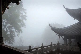 冬日,从山中古寺的回廊向外望去,大雾将外面的森林变成了梦幻世界,古树在雾中若隐若现,庙宇建筑就更显庄严而神秘了,有一种不似在人间的感觉。拍摄时曝光补偿增加,后期处理中加了蓝色以表现冬天的冷和环境的肃穆。