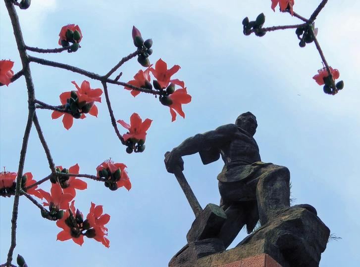 广州总工会前的工人石像,木棉花红了,互相成就,双映成趣!