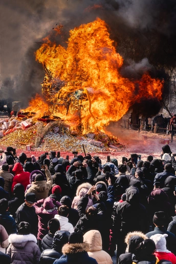 非遗过大年,是热闹,是习俗,山东昌邑瓦城孙子庙烧大牛,近万人围观狂欢,熊熊火光照亮寒冷天。 “发大牛”,发走千灾迎百福。每年的正月十四,昌邑市龙池镇瓦城孙子庙外就会人山人海热闹非凡,每年的这个时候,一场“发大牛”仪式都会在这里举行。据考证,瓦城曾是战国著名军事家孙膑的食邑。农历正月十四,相传是孙膑生日,牛为孙膑坐骑,瓦城及附近村庄保存着“发大牛”祭祀孙膑的习俗。如今,昌邑“发大牛”这一春节民俗活动成为当地村民除旧迎新,期盼新年好运的特色民俗活动。2024.2.21号本人驱车40公里前往此地探访这一当地民俗盛事,只为见证这独特的非物质文化遗产