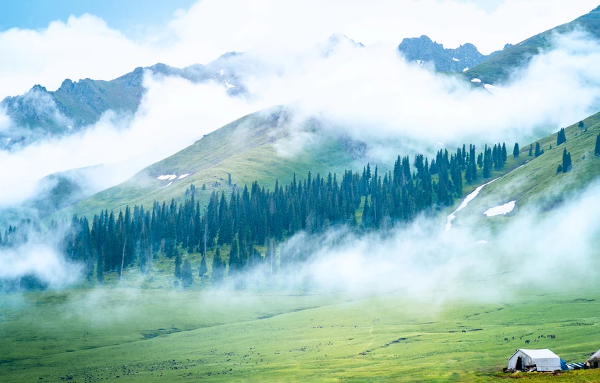 新疆伊犁那拉提大草原,云雾缭绕的大草原放牧景色。