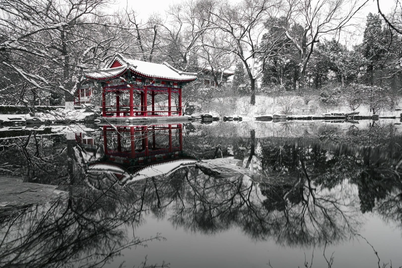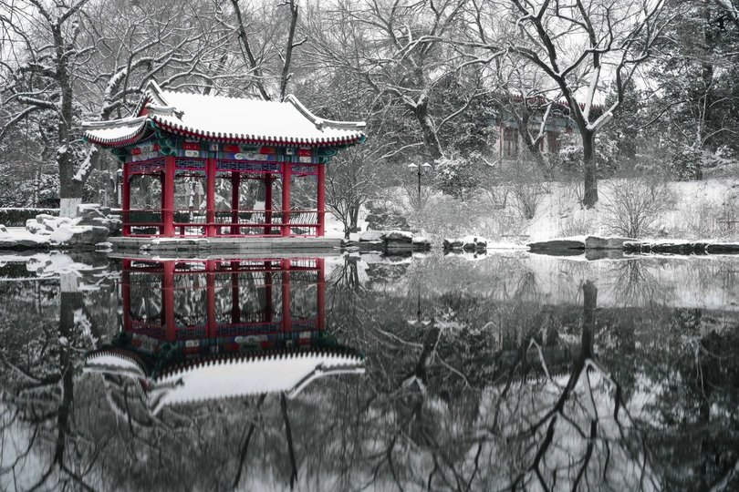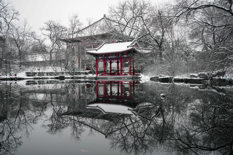 龙年第一场雪到来之际,我在北京大学拍下了鸣鹤园亭子的倒影!前期长曝光记录下丝滑倒影,后期主要通过hsl工具去除杂色,强化红色的表现力,并适当增强纹理。