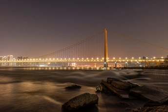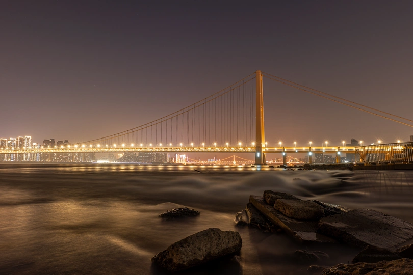 长江边取景,主体为杨泗港大桥,前景是崩腾的水流,45s长曝光拍摄