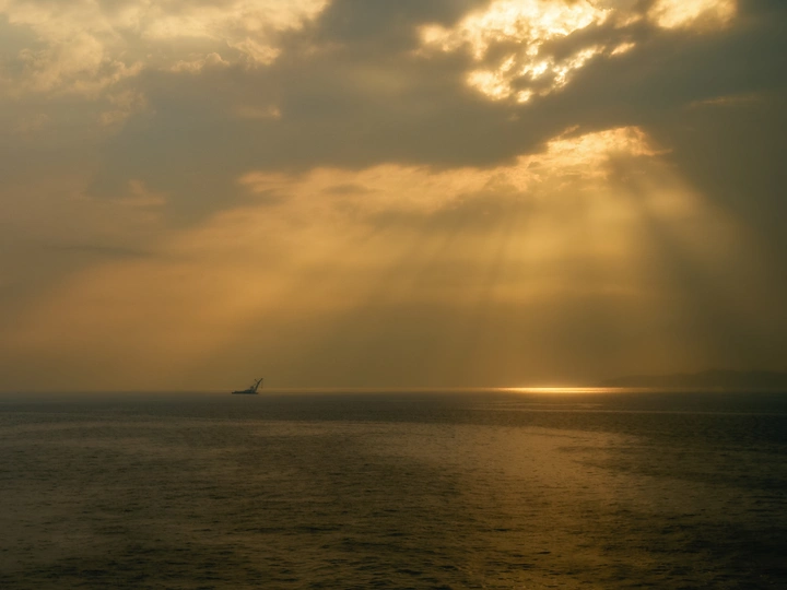 在泰国芭提雅的海边,十分钟前还在倾盆大雨,急忙跑到亭子里躲雨,坐下没有五分钟抬头就看到金色的阳光从乌云的缝隙中四散开来,倾泻而下照耀在海面上,波光粼粼,仿佛无数金色精灵在舞动,与一旁的渔船相映。