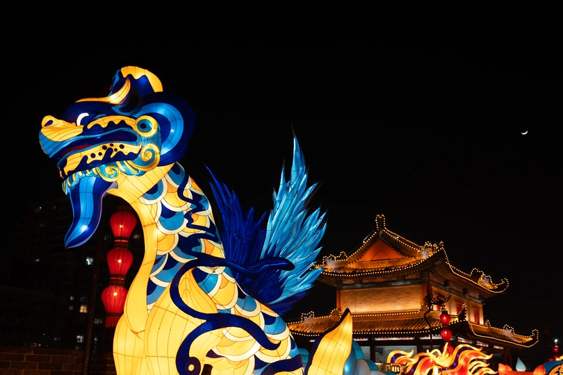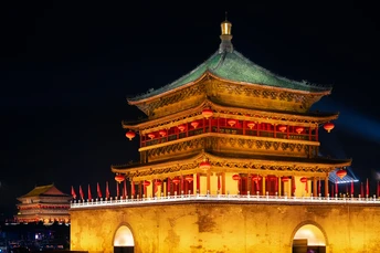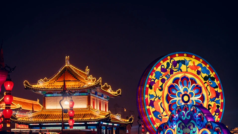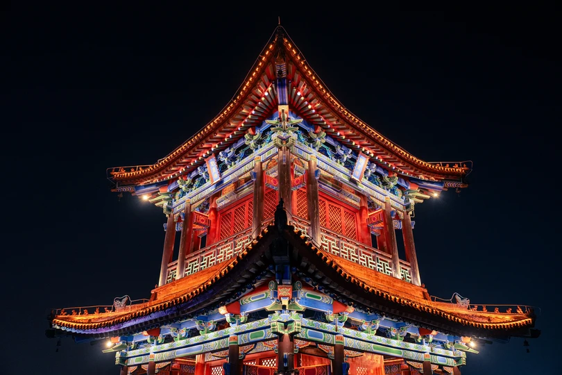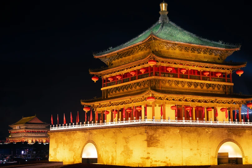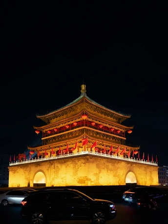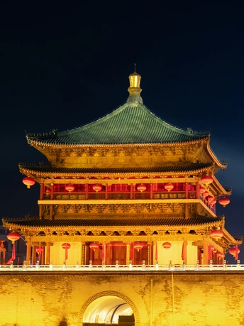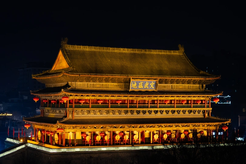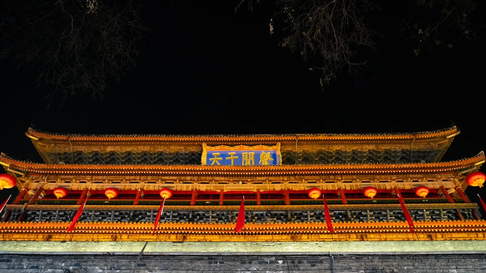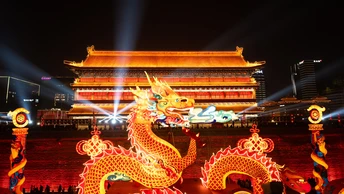 夜晚的钟鼓楼熠熠生光,城墙上的城楼在花灯和游人的拥簇下,走在城楼上,和月亮一起逛灯会