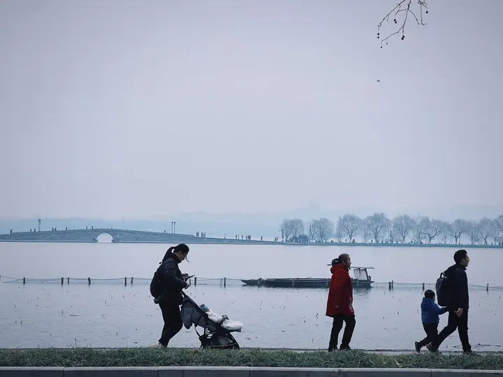 在西湖边看到一家四口,老中青三代人在游玩散步,所以就拍了下来。
