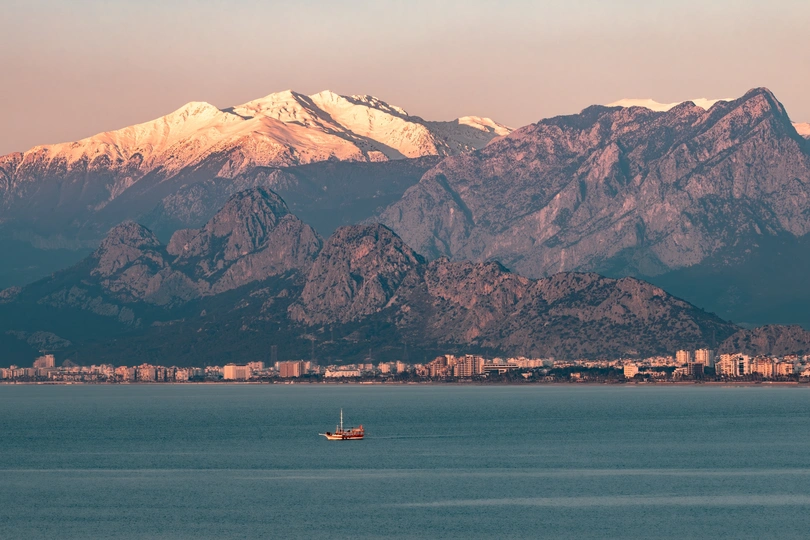 冬天安塔利亚的清晨,一缕阳光映红了海那边的雪山