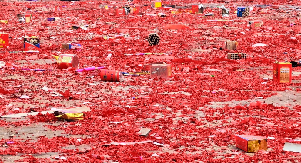 数年禁燃,让我们忘却了烟花的样子。今朝放开,从年三十晚上一直响至新年的第一缕阳光莅临,小区广场上层层的鞭炮碎屑和燃尽的焰火筒,诉说着心中的放纵与希冀……