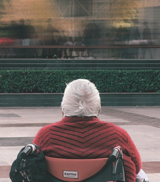 一位坐在轮椅上满头白发的老人,注视着舞池里翩翩起舞的人们。她也许在追忆曾经过往,逝去的年华。