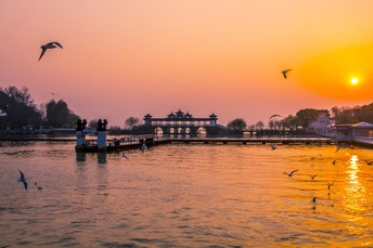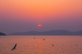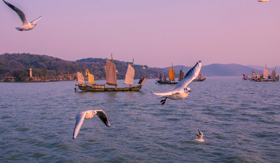 鼋头渚日落时分要坐末班船才能看到,红嘴鸥伴着落日飞,清晨的太湖是静谧而美好。