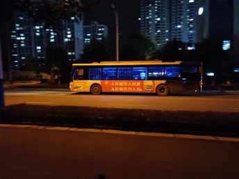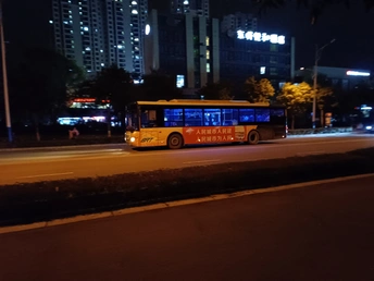 记录路灯下的公交车海格柴油十二米KLQ6129GQ1。