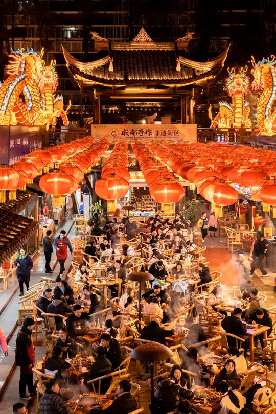 成都东门市井设置了别致的龙年灯盏,再现李劼人笔下的老成都。市民和游客在此观灯吃火锅,点燃城市烟火气。