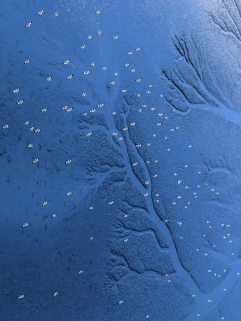 航拍视角下的东营黄河入海口 大片潮汐树栖息着许多候鸟,群鸟起飞时非常壮观
