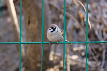 一只麻雀站在一个大笼子上