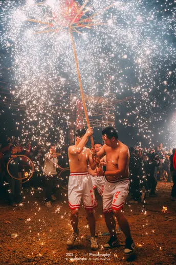 带着人们的祝愿和期盼 点燃引信 火焰与火药交织飞舞 火星在跳动 信仰让人们奔跑 那是对新一年的期盼与祈愿 火花飞舞希望也在这个天空上 起舞跳跃 让黑夜充满光明