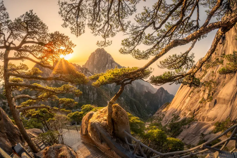 太阳从天都峰背后升起,整个山峦都蒙上一层淡淡的金色。