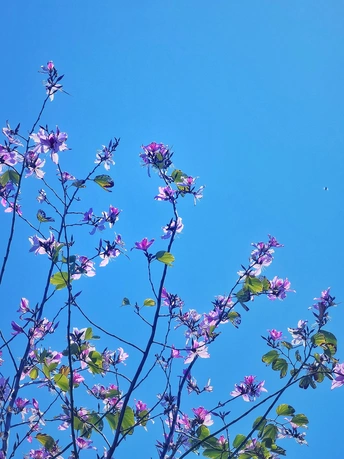 三月阳春,百花齐放。蓝天下,红花绿叶相映衬。