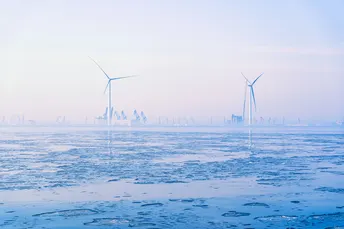 拍摄时海面起雾,隐约可见远处港口的吊装机和风车