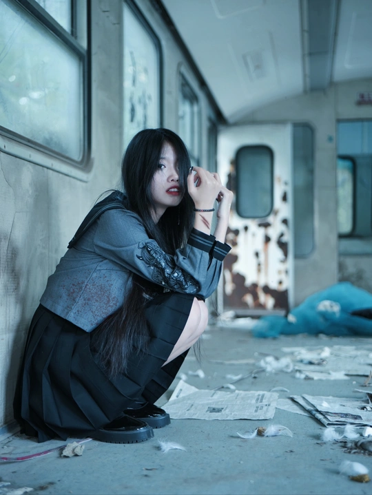 本来打算拍一组彼岸花的地狱少女,但很可惜,一场雨过后花凋零了。然后找到一节废弃车厢,创作了一组。模特本人有个被校园暴力的经历,这组照片就是复仇