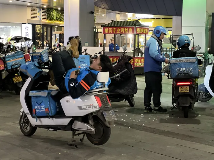 外卖小哥聚在一起等单,有一个小哥躺在电动车上都打哈欠了,恐怕只有接单工作的时候才是他们精神抖擞的时候吧!
