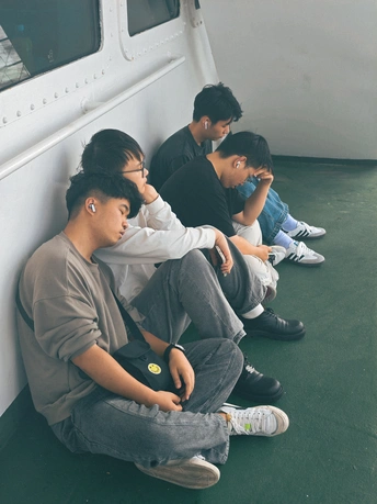 甲板上席地而坐的年轻人,带着耳机,一脸疲惫的互相依靠。