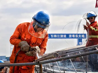 新时代产业工人正在进行地连墙钢筋笼焊接作业
