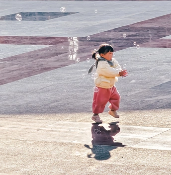 难得的晴天,抓拍公园里追逐泡泡嬉戏的孩童