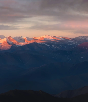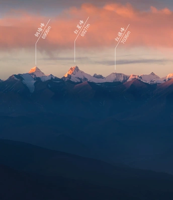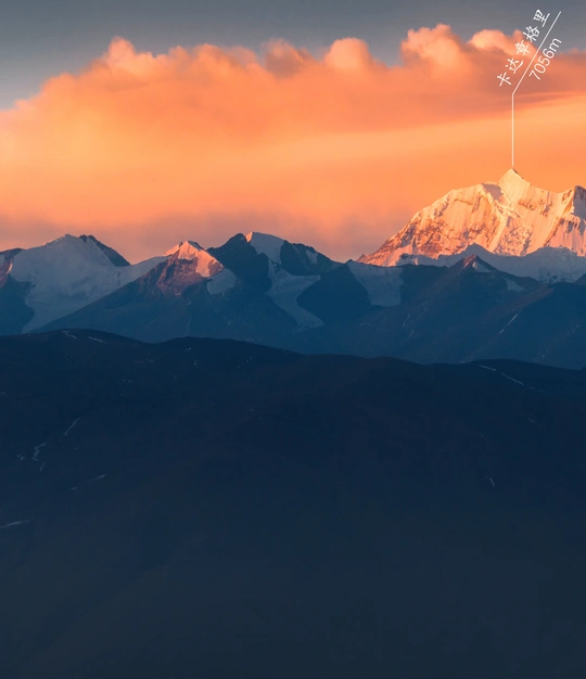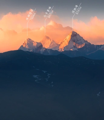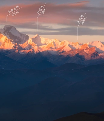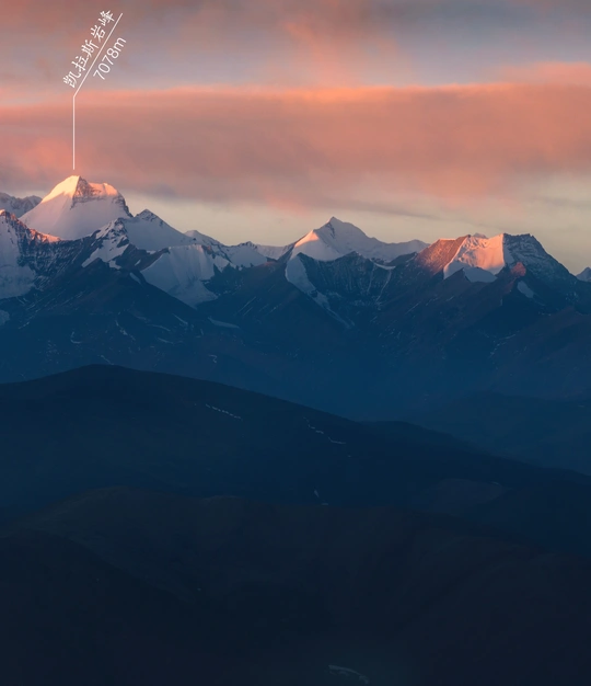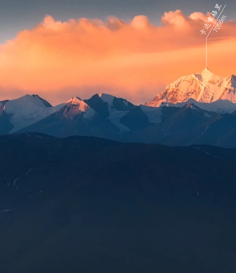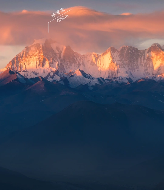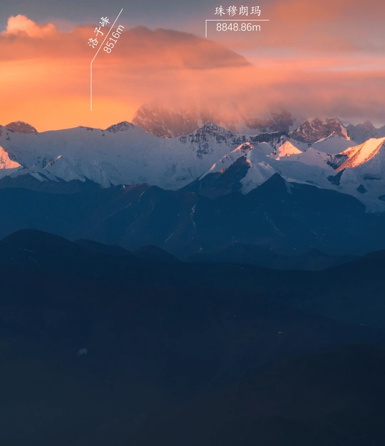 加乌拉山口的日出。进入春季,强烈的季风裹挟大量水汽给喜马拉雅山的大小山峰都配上了旗子。举大旗的珠峰与其他3座8000+巨峰。