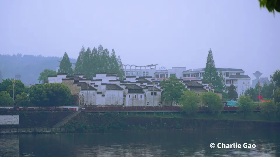 在黄山旅游时下雨天的岸边一景,朦胧拂水乡,烟雨洒徽州。