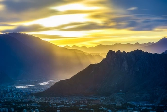 在即将离开南山公园山顶时,远处的一抹晚霞突然拨开云雾,余霞成绮,远处的重山倒也有了几分水墨画的感觉。