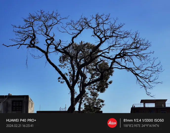 蓝天为幕,枯枝如舞,灵动分叉,树影婆娑。