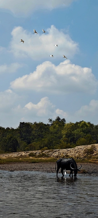 群鹤即将离开大本营,飞往更远的地方寻找更好的地方去安生,小仙鹤留下来要与一起生活好久的水牛哥哥说说悄悄话,述说着水牛哥哥对自己的照顾与爱护,水牛哥哥默默的注视着小仙鹤眼里满含留恋与不舍……动物世界与人类一样有它们的语音与情感,它们和谐相处的画面总是让人感到宁静和安详,它们在自然界中彼此相融,维系着生态平衡。