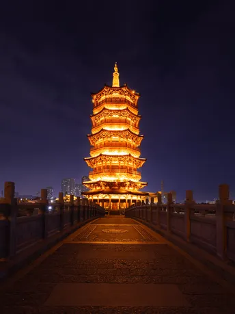 逛完洛邑古城,来到朱樱塔,刚拍了一张,灯就关了,所幸拍了一张。 朱樱塔,是洛阳八小景之一“瀍壑朱樱”的主要景观。塔的名字来源于塔内所藏的佛经《朱樱经》,这部经书被誉为日本平安朝之前的国宝级经书,具有重要历史和文化价值。朱樱塔内布置有佛像和经典等宗教文化物品,营造出虔诚的信仰和庄重的气氛。春天时,塔下的樱花与古塔相映成趣,构成美丽的景观。 经过上千个光源亮化后,朱樱塔建筑线条清晰,立体感增强。