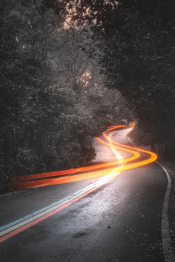 傍晚森林深处,一辆汽车驶过,尾灯在长曝光下化作绚烂车轨,仿佛流光般飞驰而下