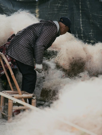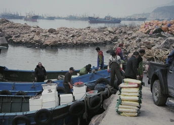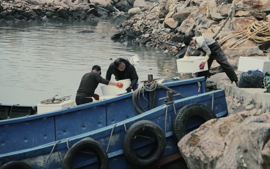 霞浦三澳村,村里人家的生活都跟捕鱼息息相关,路过人家,能看到村民忙碌着剪着密密麻麻的渔网。码头处,归来出行的渔船不停穿梭,归来的船只上载着一筐筐梭子蟹,一箱箱八爪鱼和鱼类,和螺类,买家开着卡车面包车来上货。渔民们用最传统的人工接力方式把这些刚捕捞上的海货装进这些车子里,驶向属于他们的最终去处。