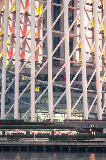 黄昏,用长焦镜头拍摄下有轨电车和广州塔。