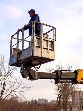拍摄于内蒙古呼和浩特市小草公园。园林工人高空作业